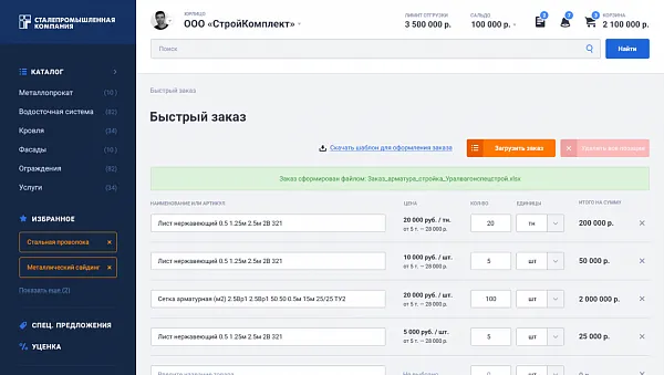 При оформлении заказа в личном кабинете предусмотрен инструмент быстрого заказа: можно загрузить список товаров из файла или быстро ввести нужные артикулы вручную и весь список отправить в корзину для оплаты. Это особенно удобно для постоянных клиентов СПК, которые регулярно заказывают одинаковую продукцию и хотят оперативно оформлять заказ.