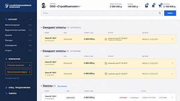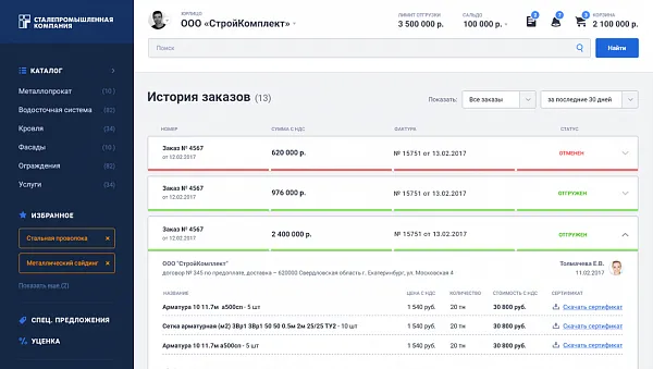 На портале реализован личный кабинет клиента, в котором покупатель может самостоятельно управлять собственной оргструктурой, заводить новых необходимых пользователей и определять им роли (администратор, менеджер, бухгалтер), просматривать историю заказов в разрезе оргструктуры, просматривать баланс взаиморасчетов и детальную информацию по совершённым платежам и выполненным отгрузкам, а также получить счёт на оплату.
