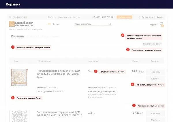 Проанализировали интерфейс личного кабинета контрагента с точки зрения юзабилити и функционального наполнения. Выявили погрешности в работе с корзиной, каталогом и карточками товаров, которые уменьшают вероятность покупки.
