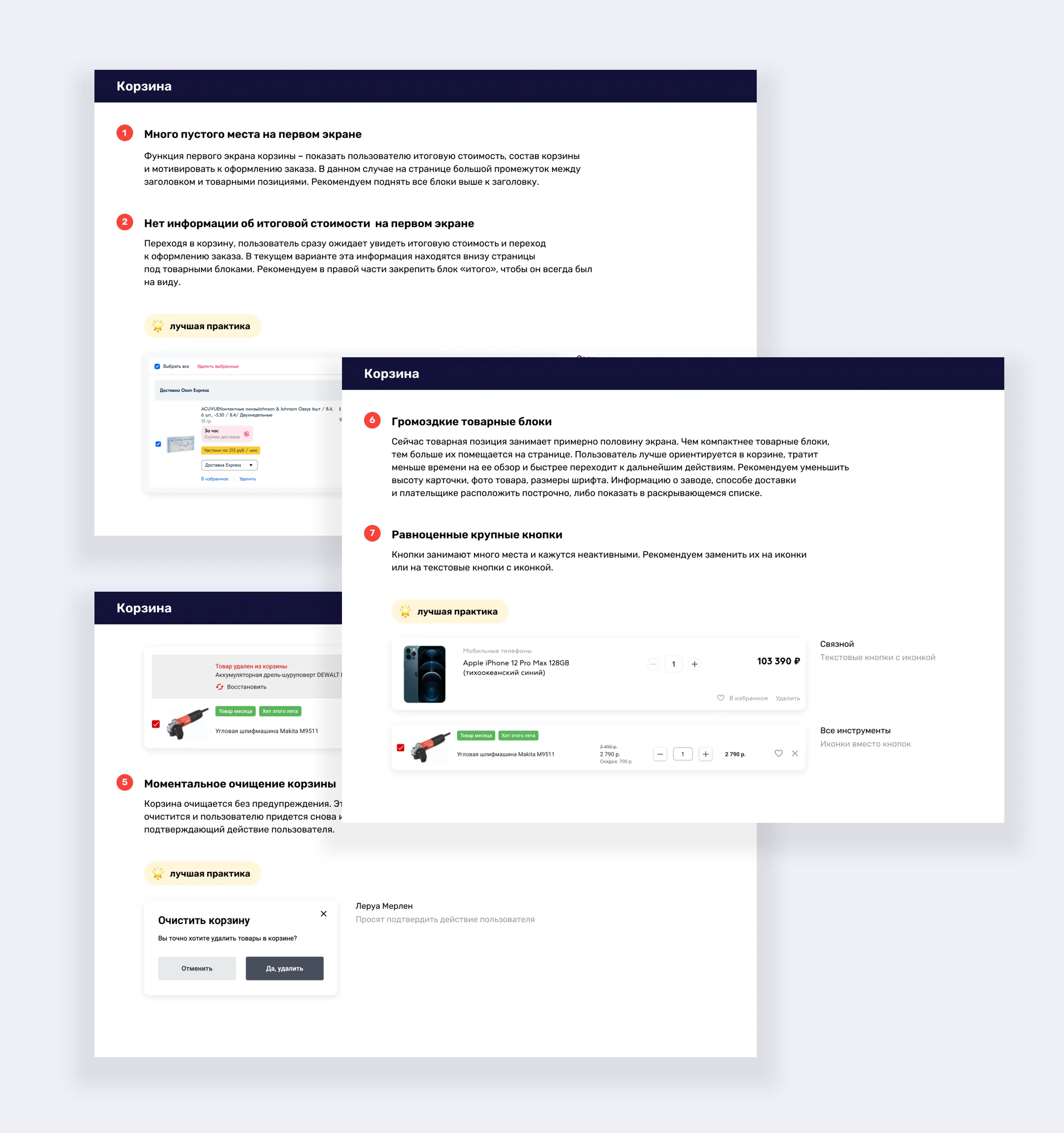 По результатам аудита мы дали рекомендации по исправлению каждой выявленной проблемы и улучшению юзабилити B2B-портала в целом. Каждую из этих рекомендаций сопроводили примерами лучших практик на рынке e-commerce. Среди референсов – «Яндекс.Маркет», «СберМегаМаркет», Ozon и другие онлайн-площадки.
