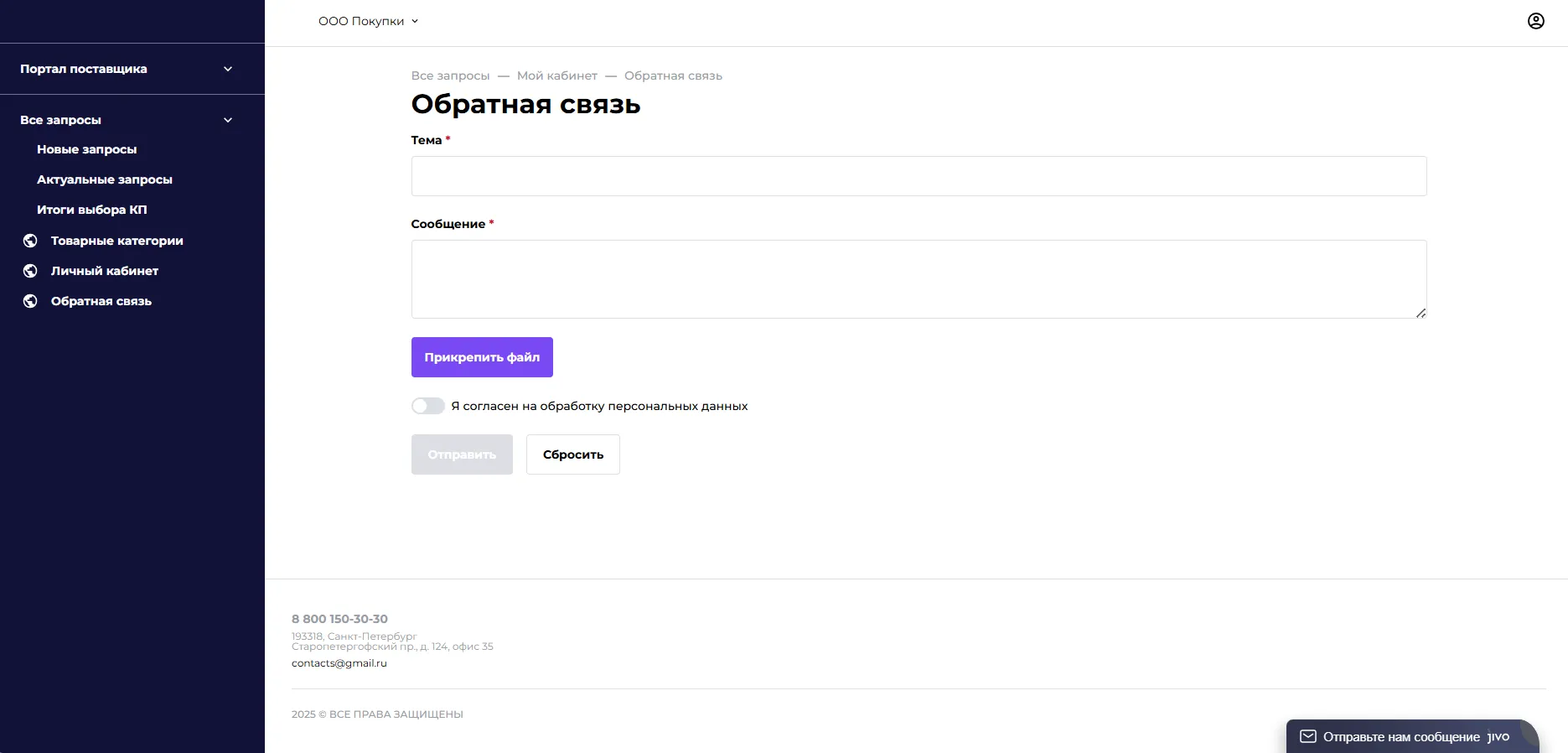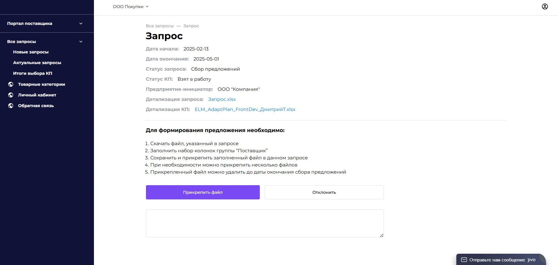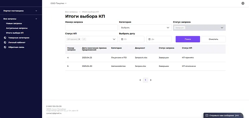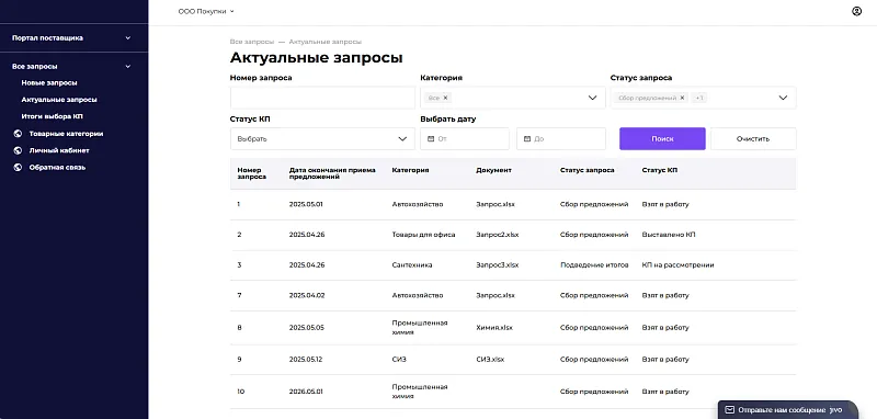 Поставщики работают через личный кабинет: подают предложения, отслеживают статусы, управляют каталогом.