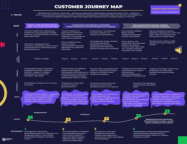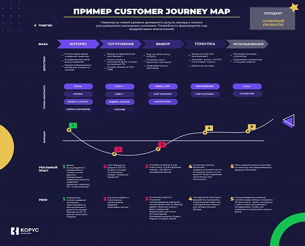 Карта отражает поведение потребителей: их действия, ожидания, опасения, идеи, мысли, эмоции в каждой точке контакта с вашей компанией — всё то, что влияет на принятие дальнейших решений. Инструмент показывает, в каких моментах клиенты отказываются от покупки или уходят к конкурентам, и подсказывает направление изменений.